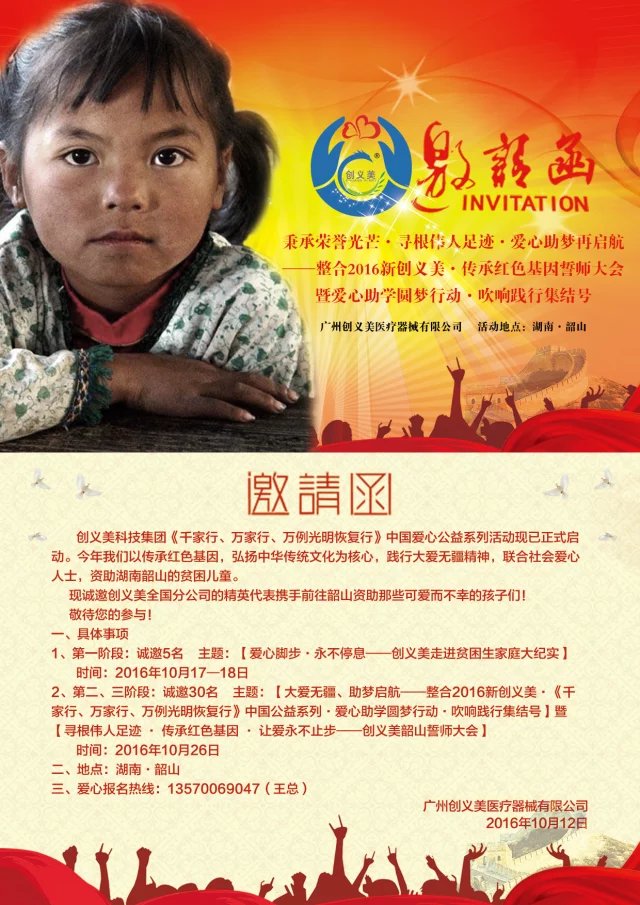 大爱无疆·捐资助学·助梦起航——整合2016新创义美《千家行、万家行、万例光明恢复行》中国公益爱心助学活动现已正式启动。践行大爱无疆精神,诚邀创义美全国分公司的经营代表携手前往韶山资助这些可爱而不幸的孩子们!