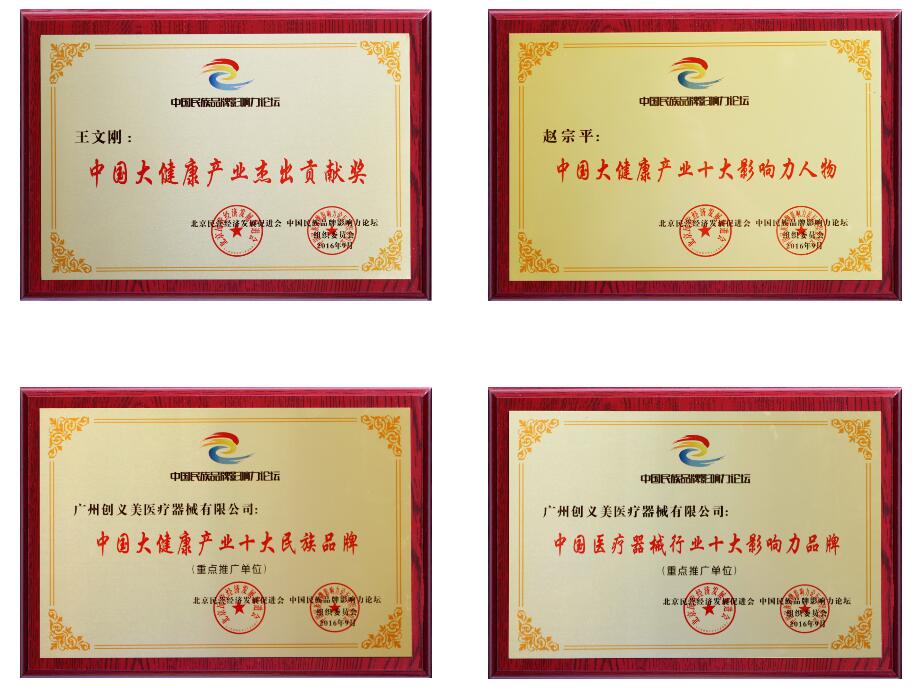 9月份创义美受邀参加2016全球企业家论坛杭州峰会,荣获“中国医疗器械行业十大影响力品牌”与“中国大健康产业十大民族品牌”等大健康行业最高荣誉,并经论坛组委会前期权威数据调研机构从全球3000名知名企业家中遴选,创义美科技集团董事长赵宗平被评选为“中国大健康产业十大影响力人物”,总经理王文刚蝉联“推动中国大健康产业杰出贡献”奖。