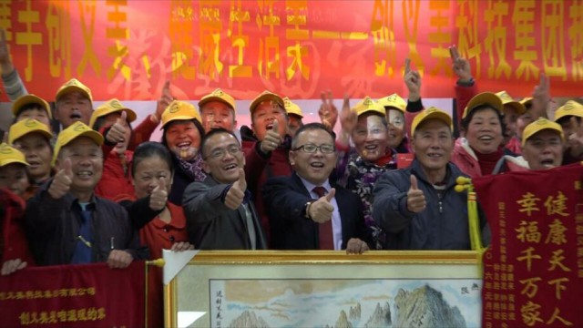 在整个过程中,叔叔阿姨为了表达了对创义美的感恩,从王总进场开始大家就全体起立,高声呐喊,期间还特别向王总送上锦旗,感情真挚,发自肺腑,气氛既温馨又感人。