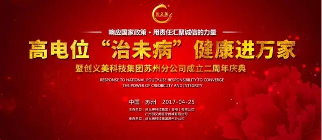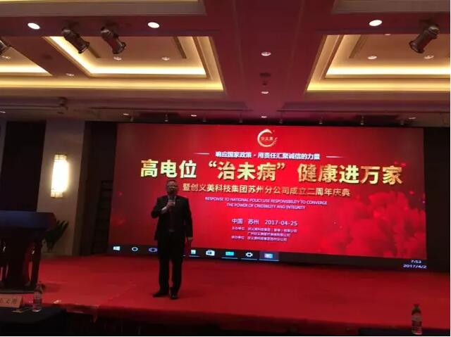 4月25日,在这个特别的日子里,创义美苏州分公司迎来了“响应国家政策•用责任汇聚诚信的力量--高电位“治未病”健康进万家暨创义美苏州分公司成立二周年庆典”的特别活动,全体员工和一直以来支持我们的体验者欢聚一堂,举办了一场隆重的庆典活动。创义美科技集团总经理王文刚还特别千里迢迢从广州赶到苏州出席本次活动盛典。