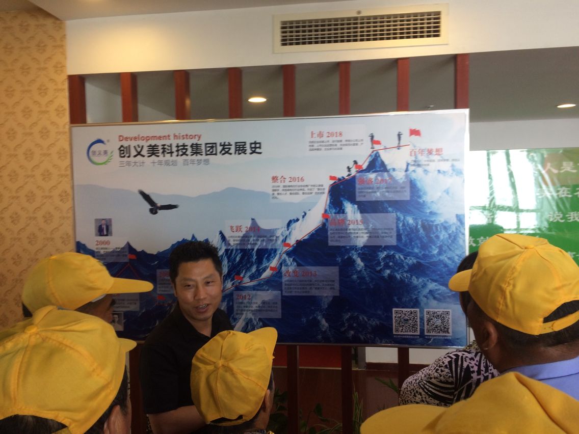 欢迎会上,创义美山东潍坊工作人员一边播放视频一边讲解,绘声绘色的向到来的体验者介绍创义美科技集团。山东分公司负责人巨楠更是贴心地在公司发展历程海报前,为大家详细讲述创义美从2000年成立至今的企业背后的故事。