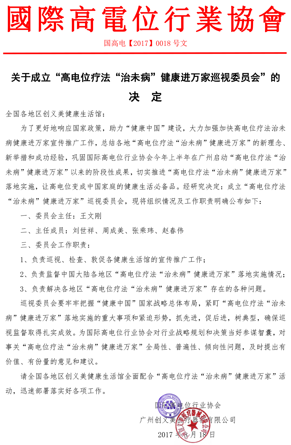 关于成立“高电位疗法‘治未病’健康进万家巡视委员会”的决定