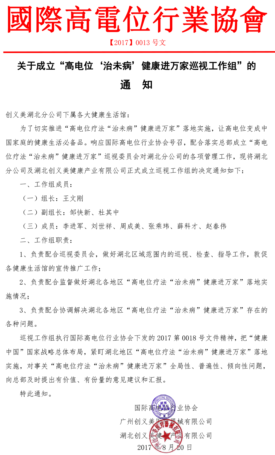 关于成立“高电位疗法‘治未病’健康进万家湖北巡视组”的通知