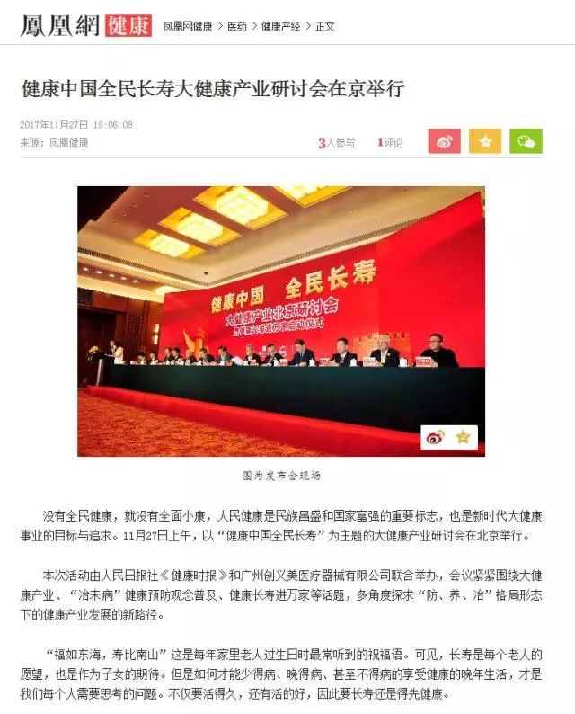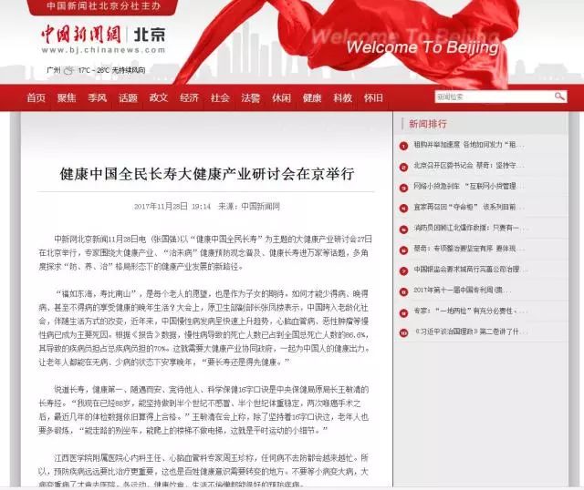 《健康中国 全民长寿——大健康产业北京研讨会暨健康长寿进万家启动仪式》圆满结束,此次会议共聚了400多位领导、专家、大健康产业的代表,从国家健康中国战略、社会需求、养老、疾病预防、长寿产业等领域共同探讨中国大健康产业创新发展的思路与方法,推动大健康产业各领域间相互融合、跨越发展。众多权威专家从各自专业领域发表远见卓识,思维碰撞,指明了健康产业的发展方向,为促进我国乃至全世界人民的健康长寿、幸福快乐献出了智慧。