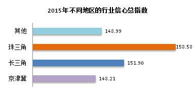 本次数据显示:珠三角地区的行业信心总指数最高为158.58,其次为长三角、京津冀地区。