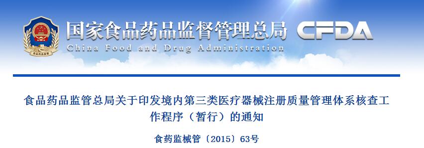 国家食品药品监管总局发布了《境内第三类医疗器械注册质量管理体系核查工作程序(暂行)》(以下简称《工作程序》),该程序对国家总局技术审评机构与省局的工作衔接、体系核查的内容、注册申请人提交的体系核查资料、核查时限、核查结果、核查结果的反馈、核查结果与产品注册审评的关联等进行了规定。